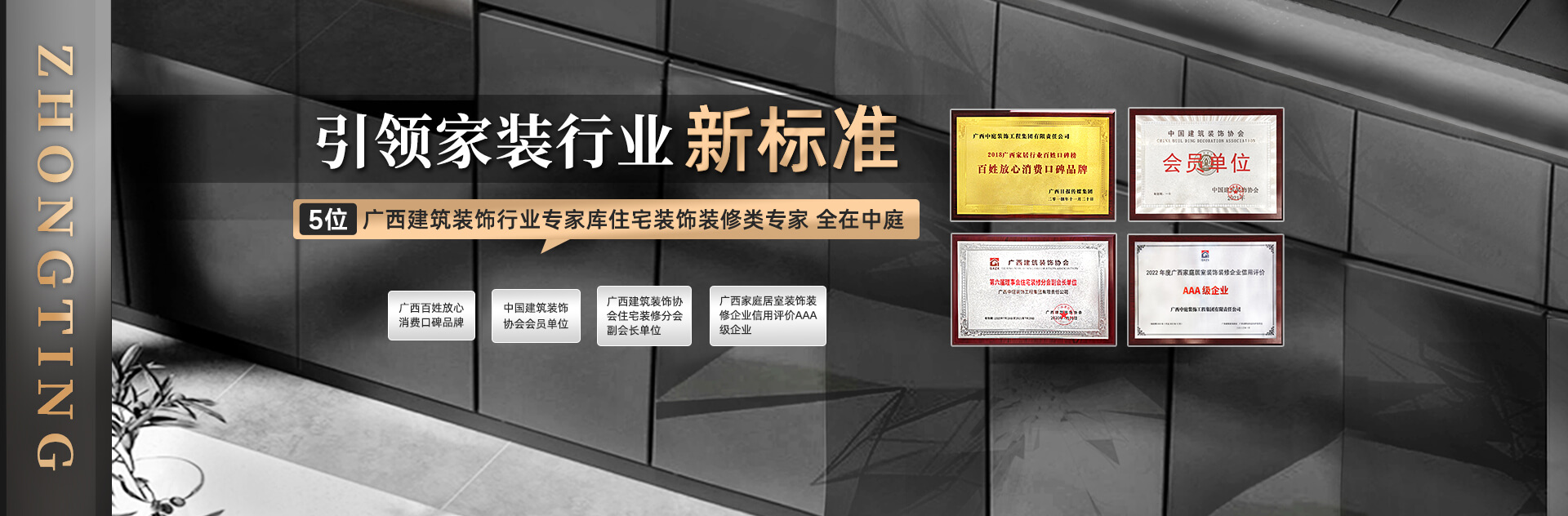 廣西中庭裝飾工程集團(tuán)有限責(zé)任公司是一家集裝飾設(shè)計(jì)、工程施工、建材銷(xiāo)售、家具生產(chǎn)、文化傳媒、商貿(mào)、投資、房屋租賃于一體,致力于提供人居環(huán)境改善服務(wù)為己任的綜合性實(shí)業(yè)聯(lián)合體。