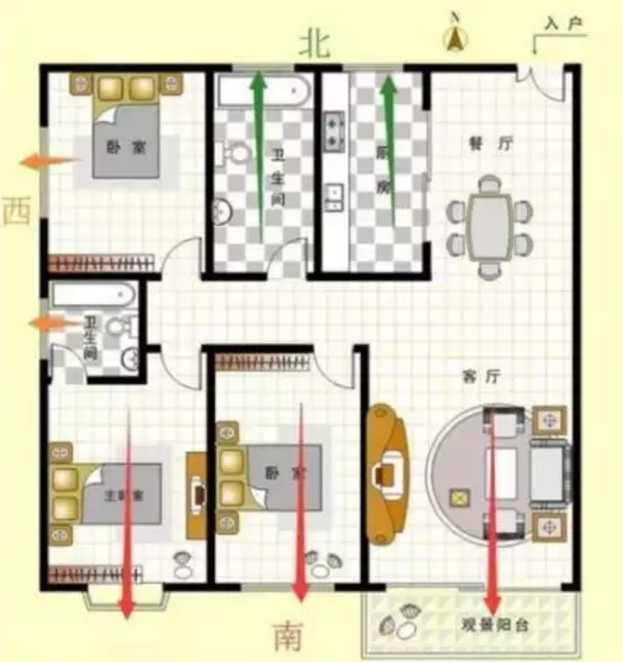 南北通透是指南北都有正對著的窗戶,能夠最大限度進行空氣對流。一般業(yè)主購房的時候,都愿意去購買南北通透的房子,講究通風性好、私密性好、符合風水說法。一般指餐廳與客廳的窗戶或者廚房與客廳窗戶正對著,形成對流的這種情況,就可以稱之為南北通透。
