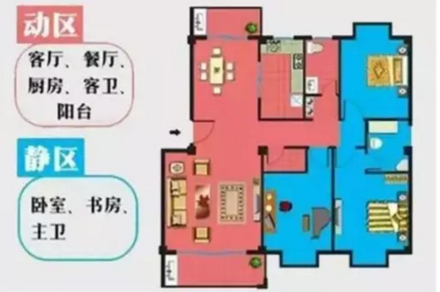 居住動線:主要是指臥室、書房、衛(wèi)生間,為主人的私密區(qū)域,最好不要跟來客動線和家務動線有交叉,影響私密性。