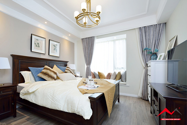 c、臥室的床品也是一個很好的參照物,歐式風(fēng)格的床品搭配歐式的窗簾。比如上圖,窗簾以米色花卉與淺咖色葉子相間,與織花床品完美融合。