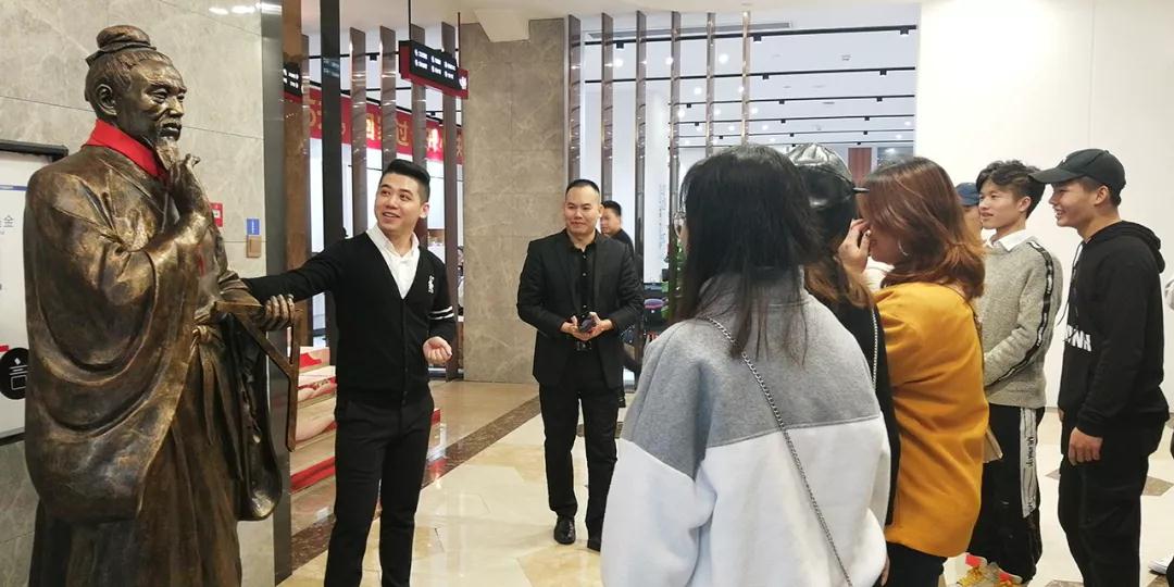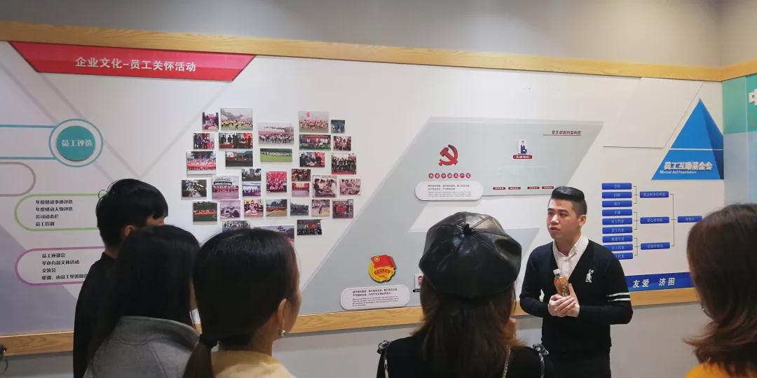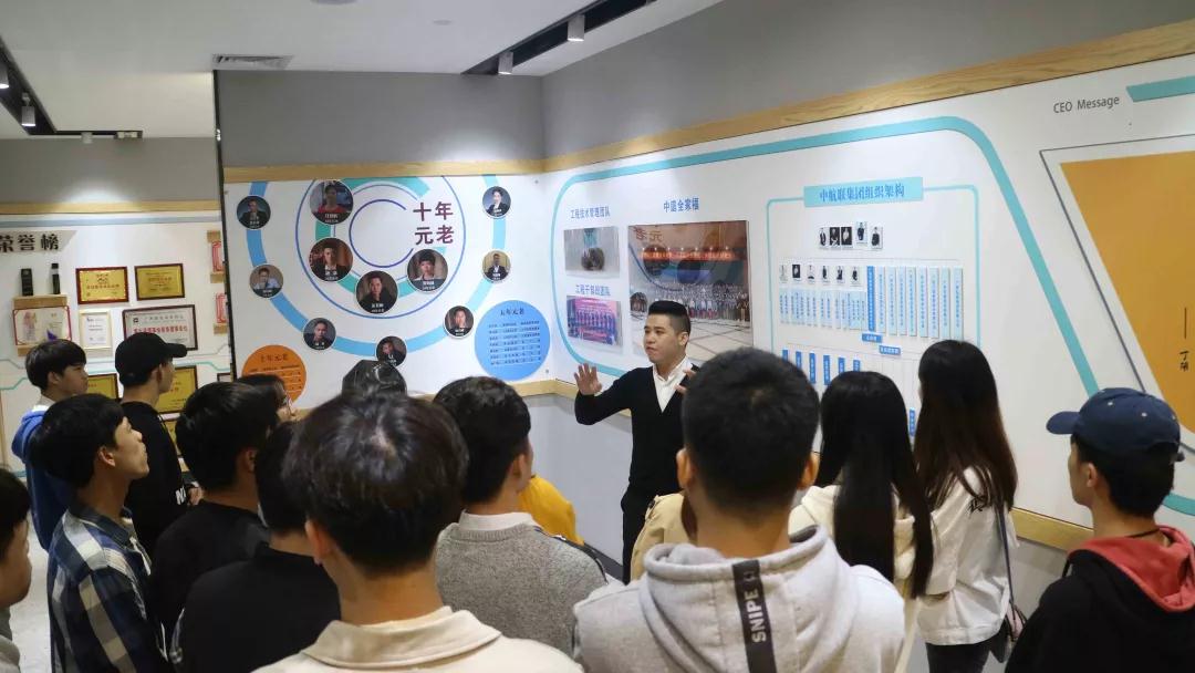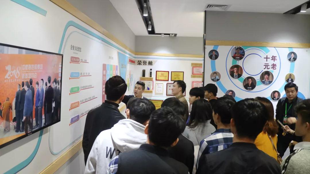 張總帶領學生參觀中庭裝飾集團文化長廊,給同學們介紹了關于中庭裝飾集團組織架構,企業(yè)愿景、使命、價值觀以及人文關懷,愛心公益等方面的企業(yè)文化。