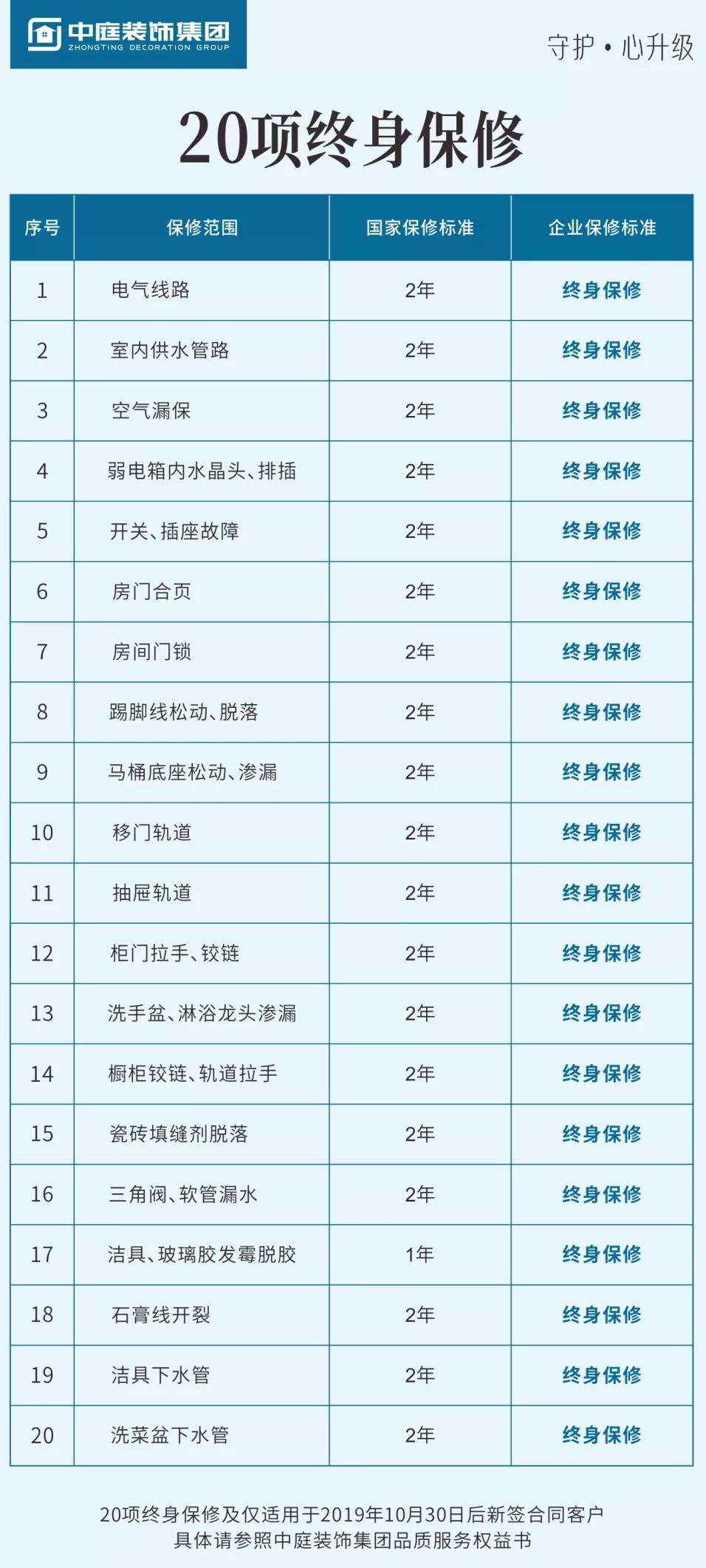 中庭裝飾集團20項終身保修上線,按照國家有關規(guī)定,保修標準為兩年的20項家裝工程,我們承諾終身保修!