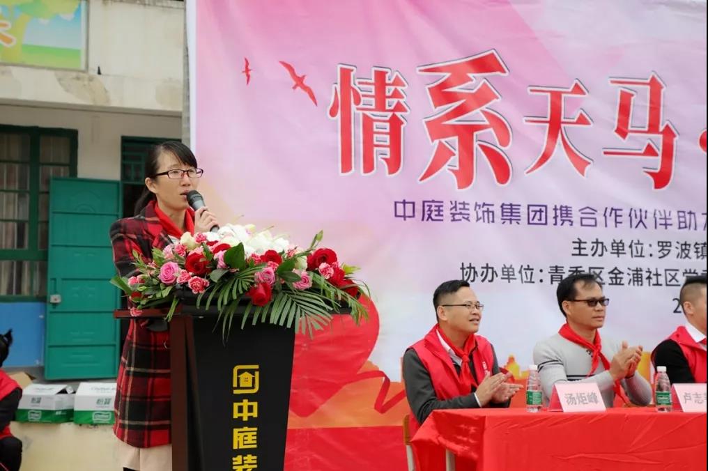 21日上午,羅波鎮(zhèn)副鎮(zhèn)長(zhǎng)吳潔、羅波鎮(zhèn)學(xué)區(qū)長(zhǎng)李宏峰、青秀區(qū)金浦社區(qū)黨委書(shū)記許二華、天馬村駐村第一書(shū)記覃干思、天馬小學(xué)校長(zhǎng)盧志善、中庭裝飾集團(tuán)總裁丁胡與副總裁金洪路、張浩熙、吳文戰(zhàn)以及中庭裝飾集團(tuán)中高層管理人員、中庭戰(zhàn)略合作伙伴代表、天馬小學(xué)全體師生出席參加了此次公益活動(dòng)。